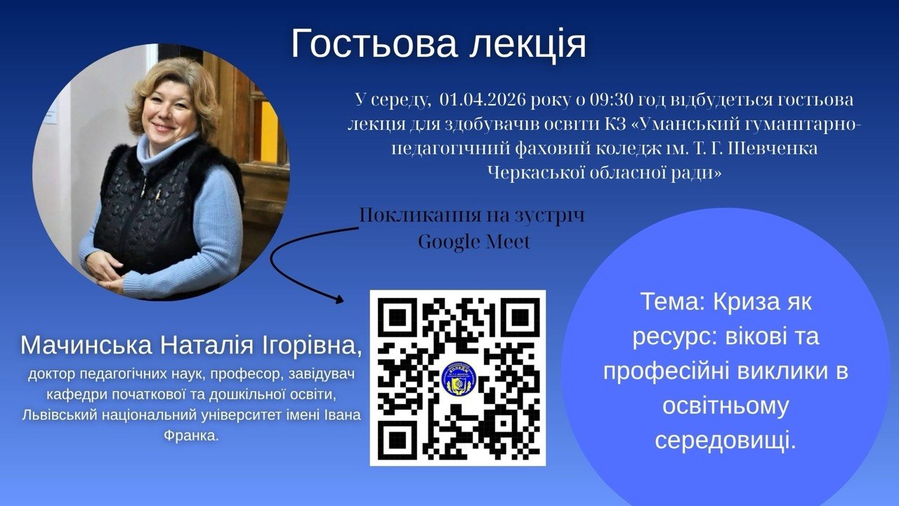 Першого квітня в КЗ «Уманський гуманітарно-педагогічний фаховий коледж ім. Т. Г. Шевченка відбулася гостьова лекція на тему: «Криза як ресурс: вікові та професійні виклики в освітньому середовищі». Детальніше