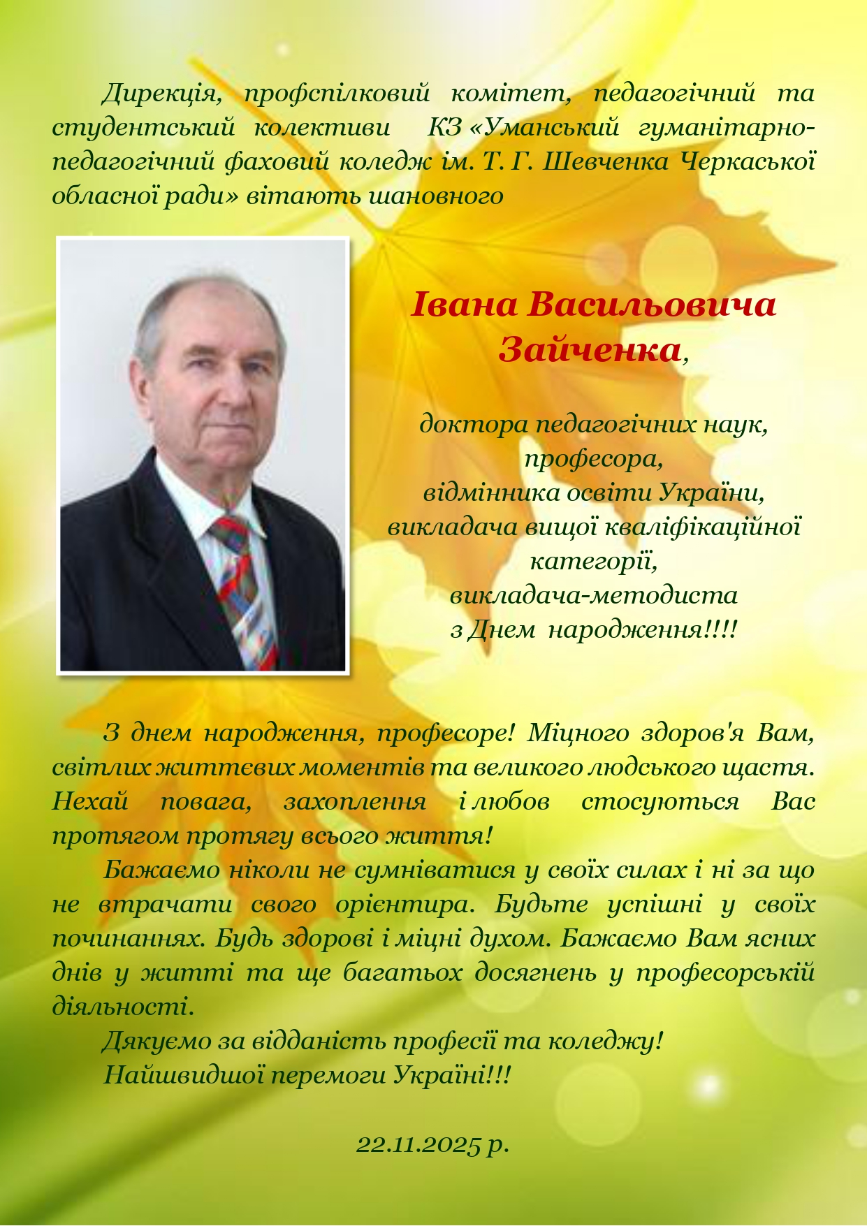 Сьогодні, 21 листопада, представники КЗ «Уманський гуманітарно- педагогічний фаховий коледж ім. Т. Г. Шевченка Черкаської обласної ради» доєдналися до громади міста Умані на віче до Дня гідності і Свободи, щоб вшанувати героїв, які стали символом мужності, патріотизму та боротьби за європейський вибір України. Детальніше